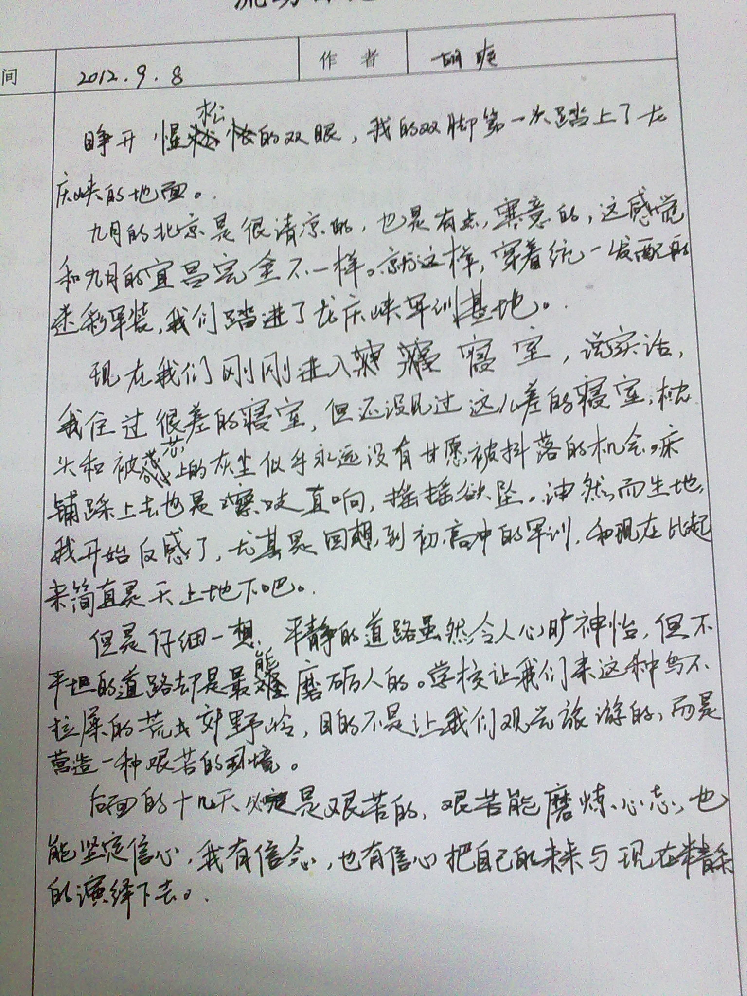 转眼间,公司135名2012级本科新生在龙庆峡员工军训基地的训练已经进入了第13天。军营里,再不见员工稚气的脸庞、单薄的身体,取而代之的是标准的军姿,严肃的纪律,坚毅的脸庞。下面,是我们摘取的部分军训学员的流动日记,以此来展示他们在绿色军营中的成长印记。请欣赏┄┄