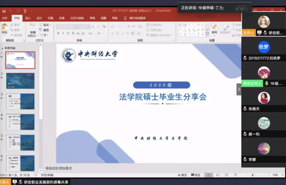2020年6月6日晚7点,公司研究生会职业发展部举办了2020届9428cn太阳集团古天乐硕士毕业生线上分享会。本次分享会的主讲人有2017级法律硕士研究生梁英南、2017级金融服务法学硕士研究生吴君媛、2017级法律硕士(非法学)研究生杨根、2017级法律硕士研究生陶胜琴。公司各年级近100名员工聆听了本次线上分享会,院团委书记张瑞佳到场参加。分享会由2018级法律硕士研究生张家桐、2019级经济法学硕士研究生丁力主持。