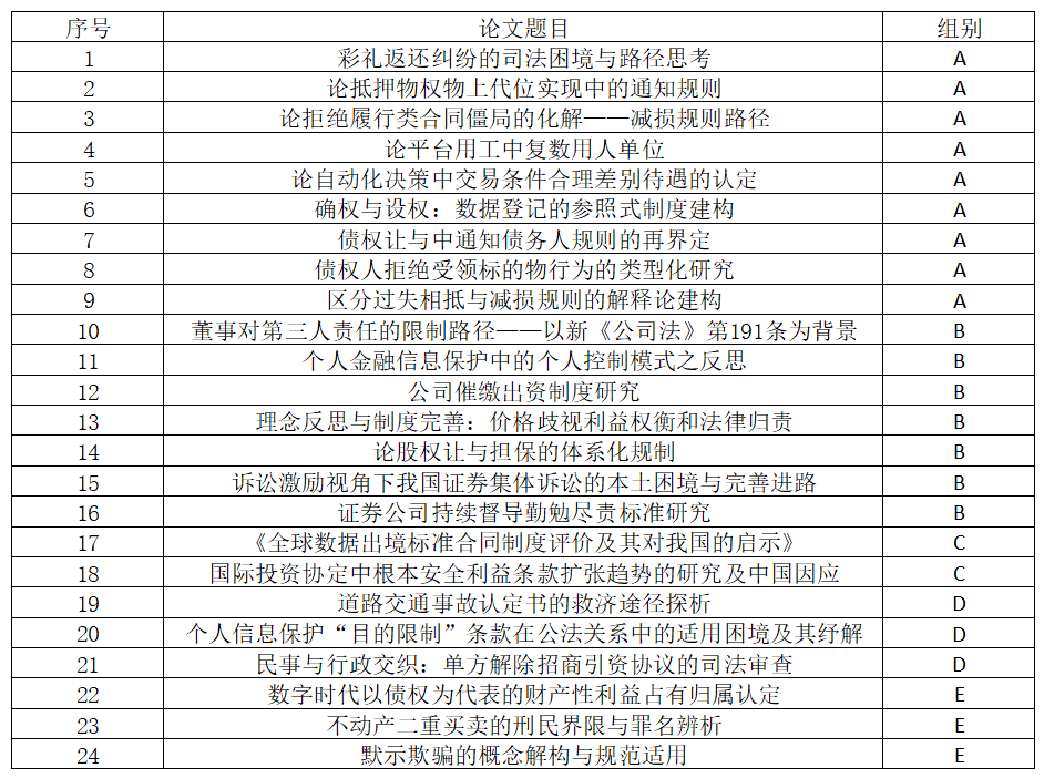 最终,经过公平、公开、公正、科学的评审,最终共有24篇作品进入终审答辩阶段,其中A组9篇、B组7篇、C组2篇、D组3篇、E组3篇,具体名单详见下图,特此公告。