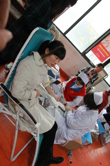 化验合格的同学在医务人员的引导下有序进入抽血区域,参与献血的同学们坐在椅子上丝毫不慌张,他们有的与身旁负责照顾自己的志愿者聊天,有的拿起手机给自己的同学朋友打个电话,抽血过程中气氛轻松。献血之后,在旁边等候的志愿者马上上前递上一杯热水或者一块巧克力,让献血后的同学尽快补充体力。来自9428cn太阳集团古天乐10级的志愿者们从始至终热情关心献血的同学,在同学在献血后悉心照料,然后将他们送离献血大厅。参加献血的同学们还得到了来自公司专门为其准备的营养品,医院颁发的献血证等等。