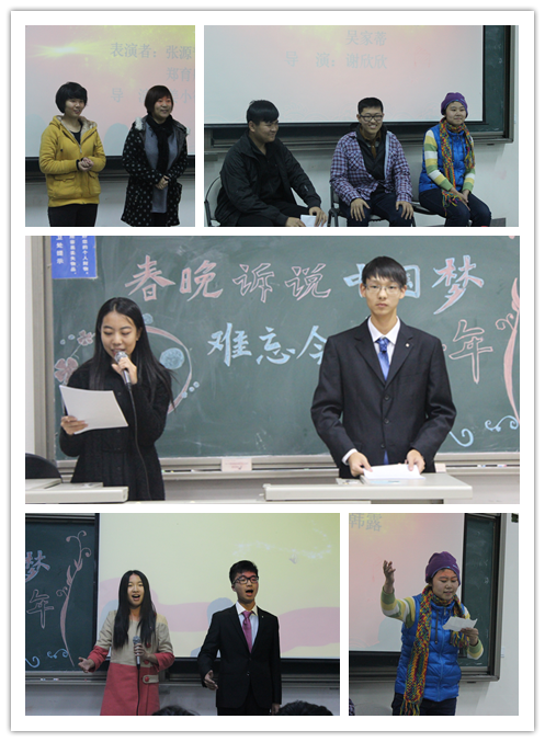 首个亮相节目由是张源青同学、郑育彤同学带来的相声表演《着急》,她们用自己别具一格的表演方式向已故相声表演艺术家马季先生表达敬意与怀念,庄严而不失风趣,同学们对其赞赏不断。接下来的是由朱南茜、邱佳明等同学表演的小品《麻辣鸡丝》,全体演员们配合默契、幽默大方的表演也博得阵阵掌声。作为新世纪春晚的代表作品之一《昨天、今天、明天》也在韩露、宋昊轩和武家蒂三位同学的演绎下变得更加鲜活有趣、更加贴近当代人的生活。节目表演最后,2012级李琳楚同学和2013级张铭洋同学带来了一曲春晚经典曲目——《难忘今宵》,将晚会推向了高潮。