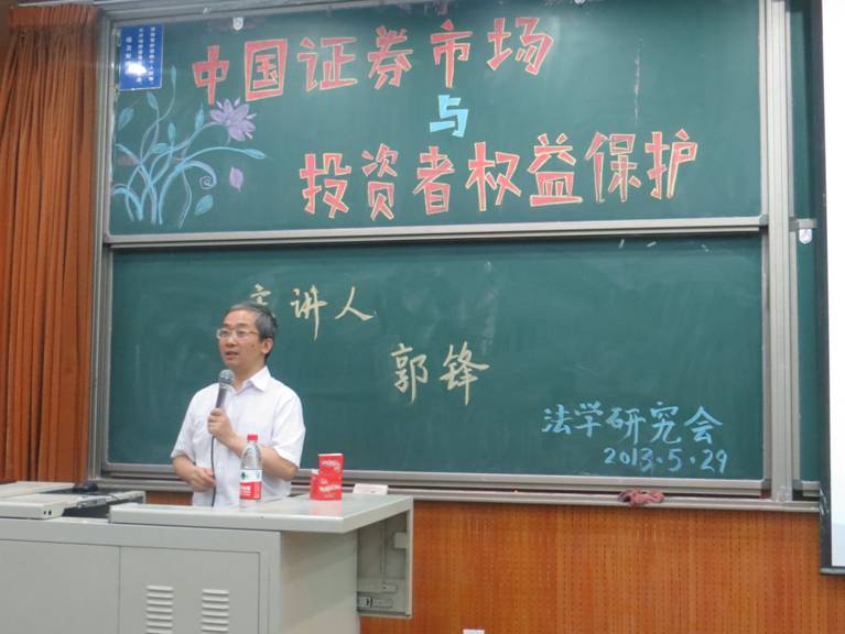 郭锋教授以其自身丰富的阅历、专业的法学素养和对于证券市场的深刻见解为我们呈现了一场精彩的讲座。他从一些经济学的概念结合法学的思维方法入手,引入有趣而发人深思的精彩案例,向同学们深入介绍了中国证券市场,并提出他对投资者权益保护的独特见解,进而提出推进中国金融法制的伟大目标,使同学们受益匪浅。本次活动不仅令同学们学到了许多金融证券方面的知识,更令同学们学会了一种法律人的思考方式,体味到了在经济发展中法律的巨大作用。