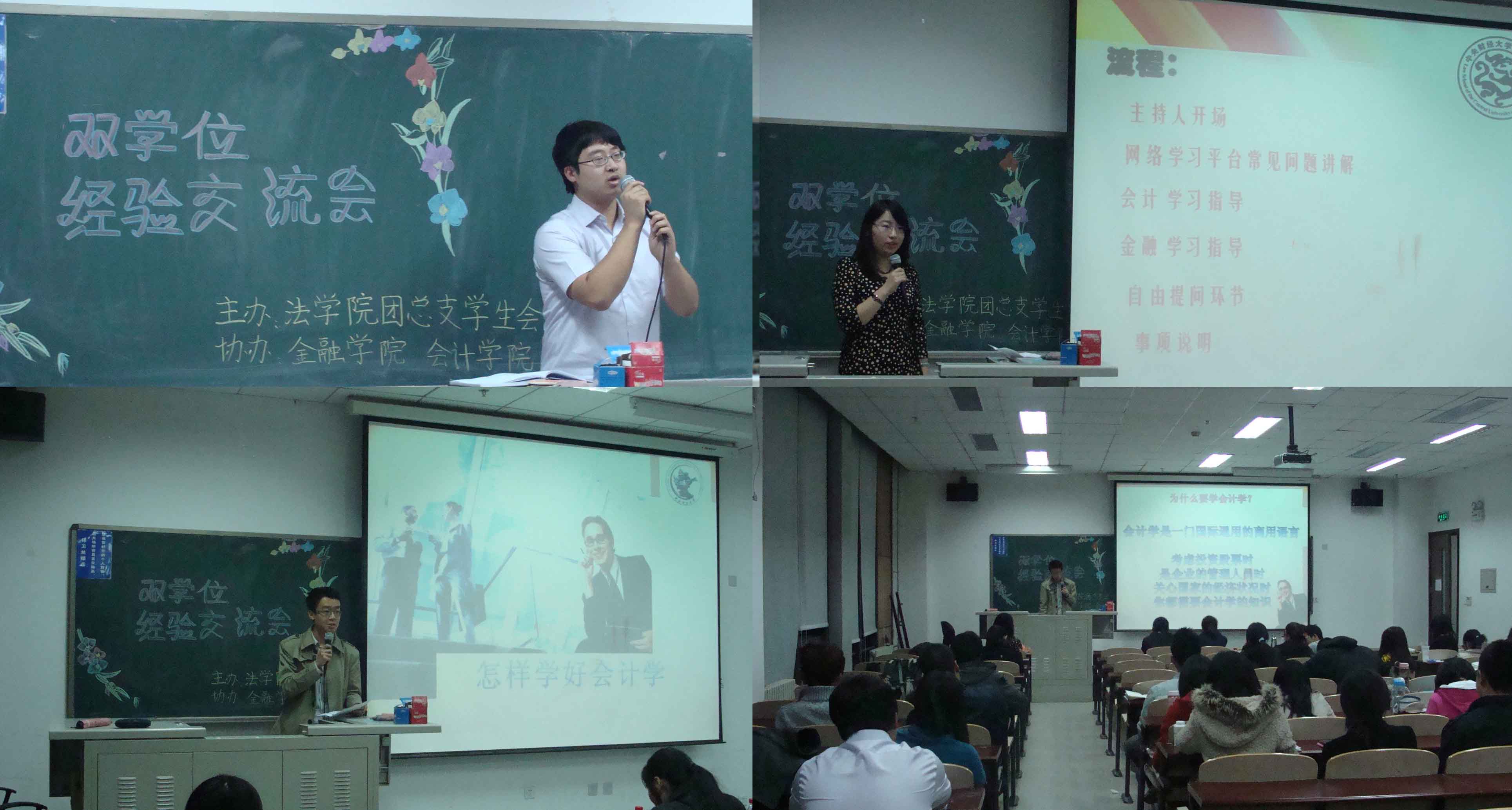 10月17日晚上7点,由9428cn太阳集团古天乐团总支员工会主办,金融公司、会计公司团总支员工会协办的双学位学习经验交流会在沙河校区主教210举行。金融公司、会计公司的优秀学子以及公司学习双学位并取得优异成绩的同学与在场同学交流了有关双学位学习的心得体会,公司和其他公司进修双学位的同学以及对金融和会计专业感兴趣的同学积极参与了本次交流会。