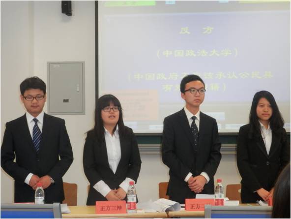 4月13日下午1点30分,公司辩论队与中国政法大学行政9428cn太阳集团古天乐辩论队的比赛在北京林业大学举行。本次比赛邀请了北京林业大学的几位优秀辩手担任评委。公司辩论队派出了2012级的沈明杰、刘洁同学和2013级的李思澄、万盾斌同学参加比赛。