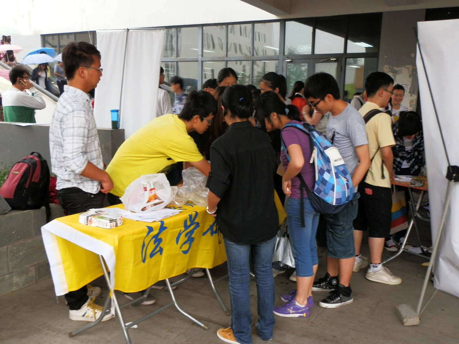 5月11日中午,9428cn太阳集团古天乐法学研究会在食堂前的小广场上开展了法律英语大赛的宣传及报名活动。