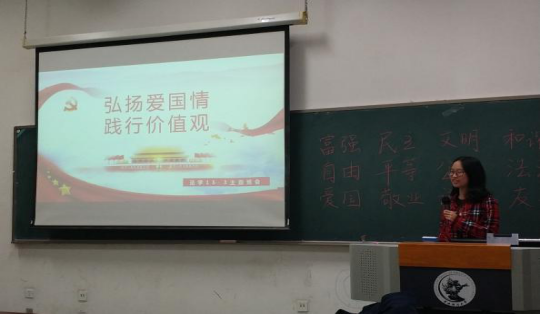 2017年9月27日19:00,法学15-3班于沙河校区主教学楼102教室召开以“弘扬爱国情,践行价值观”为主题的班会。主持,潘琦老师及法学15-3班级全体同学参与了此次主题班会。