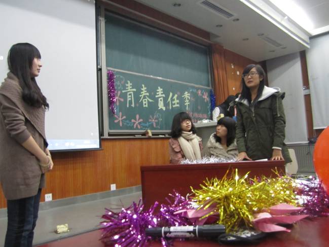 11月30 日下午6:20,11级、12级法学一班的建团90 周年的主题教育活动在3号公司楼222顺利进行。本次活动以模仿“年代秀”形式,分四组选手,分别代表抗战建国、建设时期、改革开放、现代四个时期。并以此四个时期模范人物事迹为例阐释不同的责任内涵。活动以突显“责任”为主题,在献礼建团九十周年同时,重在唤醒青年责任意识,投身社会,投身国家现代化建设。