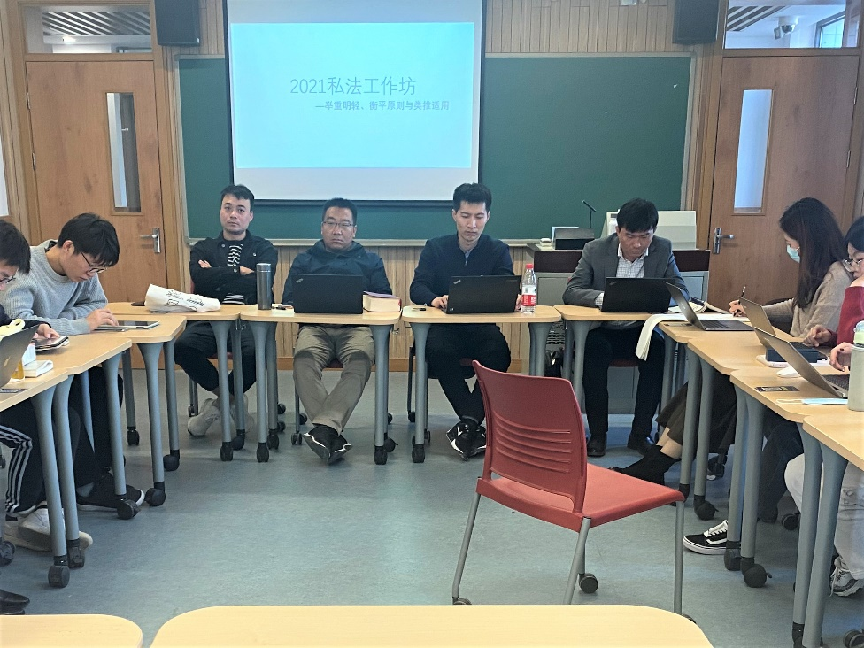 2021年11月24日下午14时至17时,9428cn太阳集团古天乐第30期私法工作坊在公司南路校区主教401如期举行,本期工作坊以“研讨民法解释和适用的方法”为主题,采取线上直播与线下研讨同步举行的方式举办。公司朱晓峰副教授、王叶刚副教授、王道发副教授、武腾副教授、徐建刚博士和30余名同学共阅经典、交流研讨。