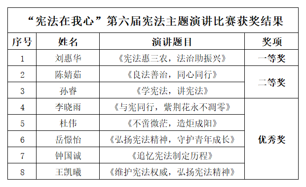 最终,评委们综合两轮比赛情况,从演讲主题、文稿内容、文字结构、语言艺术、感染力、时间要求等六个方面对选手的表现进行了综合评定,获奖情况如下。