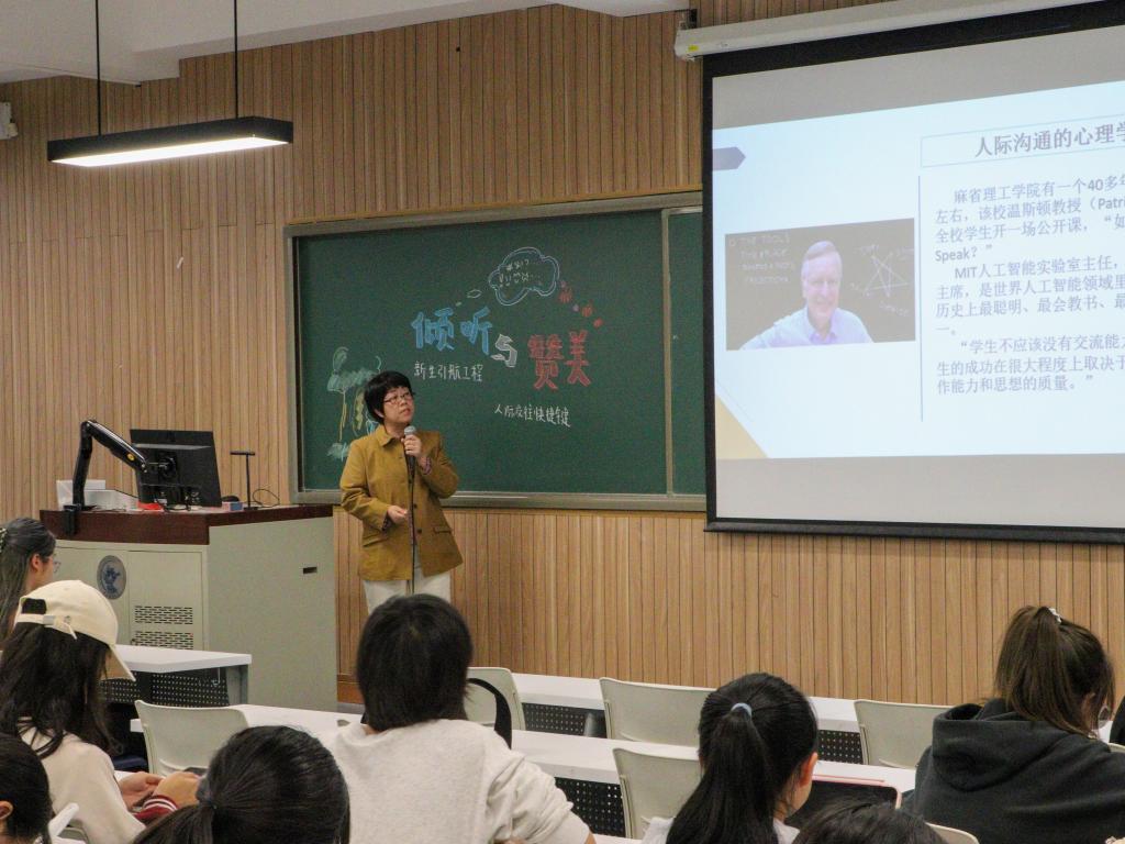 2023年10月13日下午17点,公司在公司南路校区主教楼117教室举行新生引航工程之“积极倾听与赋能赞美——人际沟通的快捷键”主题讲座,本次讲座由公司教育管理研究员南荣素老师主讲,2023级辅导员郭亦岚老师出席,2023级全体本科新生参加。