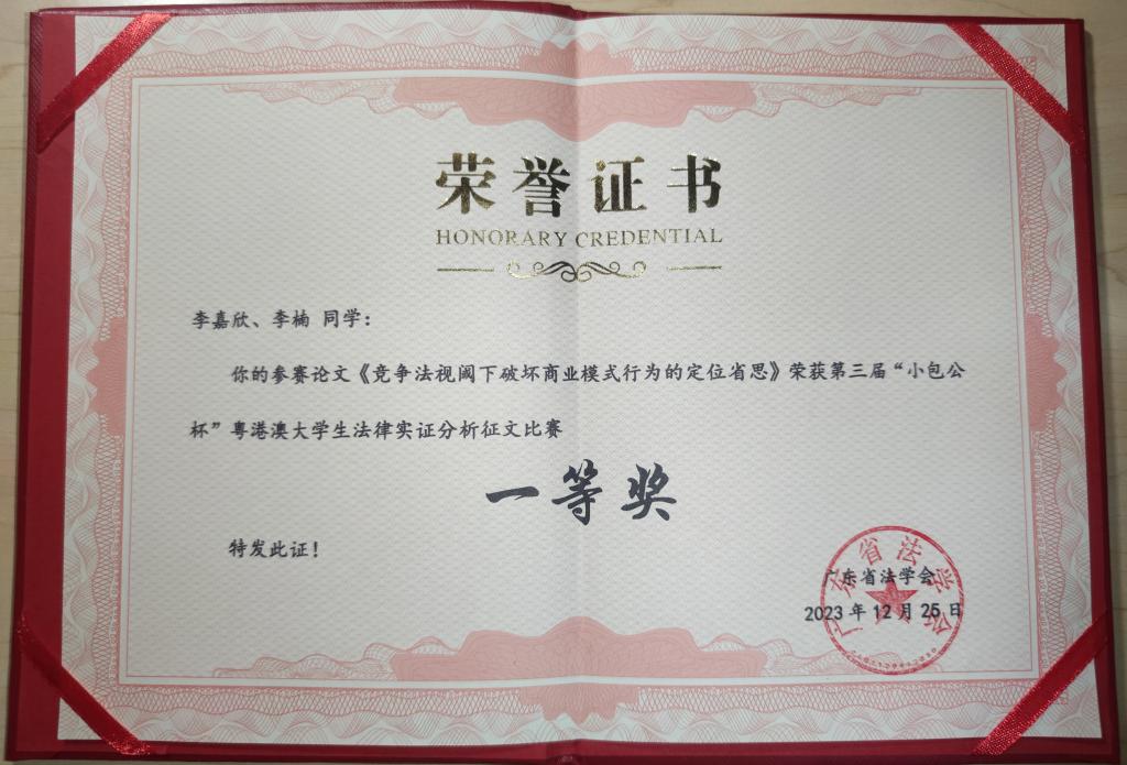2023年12月15日,第三届“小包公杯”粤港澳老员工法律实证分析征文比赛获奖结果出炉。公司22级法学硕士李嘉欣、李楠投稿的论文《竞争法视阈下破坏商业模式行为的定位省思》获评一等奖。