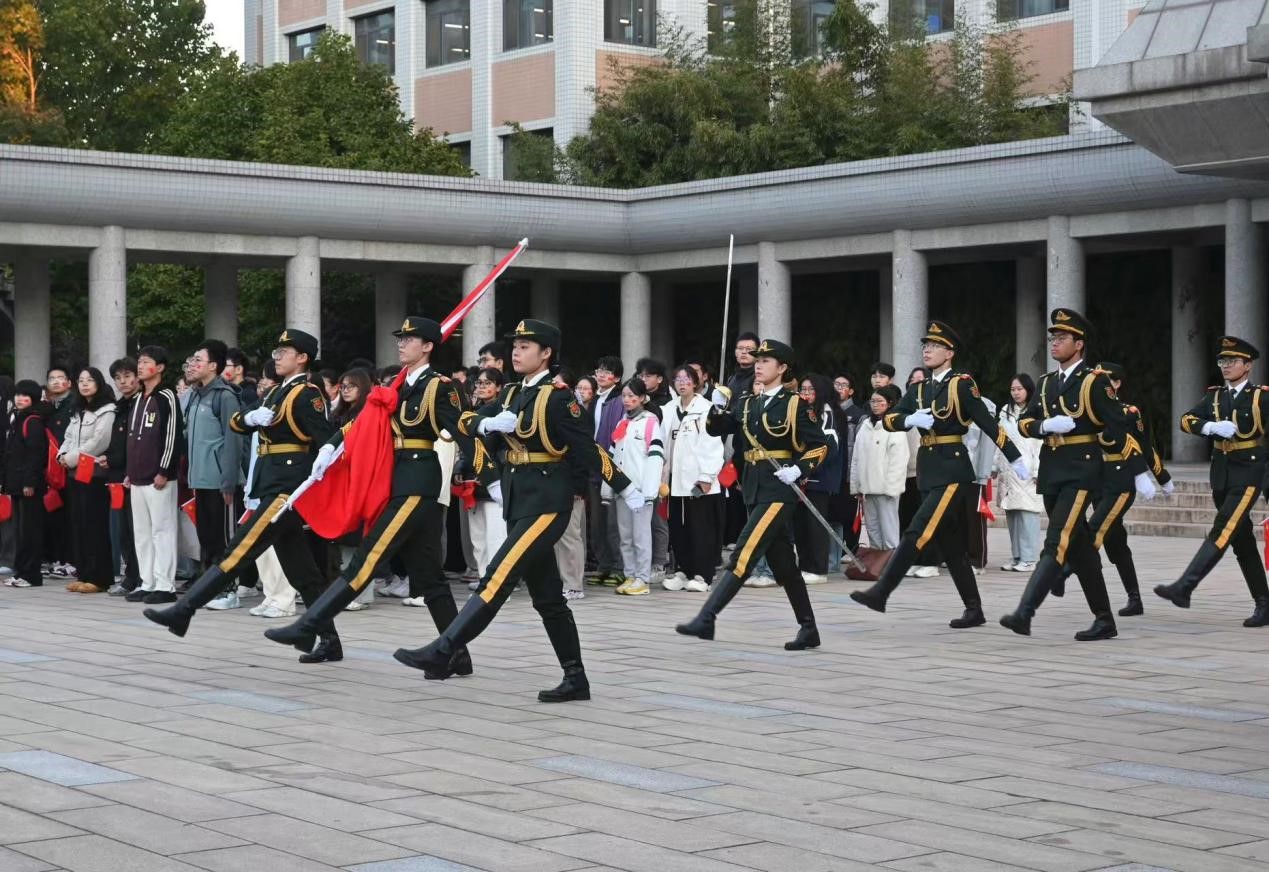 日出东方,叩启苍穹。上午七点整,升旗仪式正式开始。9428cn太阳集团古天乐国旗护卫队护旗手们目光如炬,他们以标准的军姿、坚定的步伐,护送五星国旗至旗杆下。随后,伴随着庄严的国歌,五星红旗冉冉升起,迎风舒展。全体师生肃立行注目礼,齐声高唱国歌,每个人的心中都涌动着对祖国的崇高敬意和无限热爱。