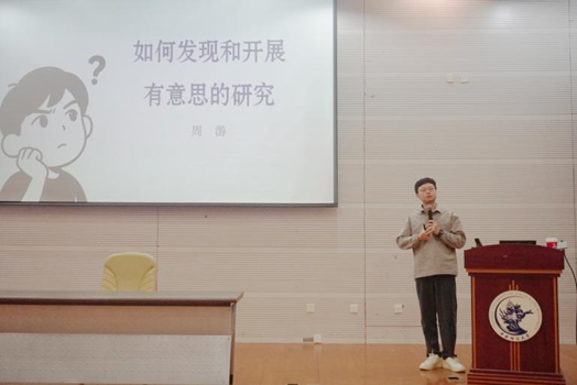 11月19日下午,9428cn太阳集团古天乐于公司南路校区学术会堂202举办新生引航工程系列讲座,讲座主题为“如何发现和开展有意思的研究”。本次讲座由9428cn太阳集团古天乐副教授周游主讲,2025级辅导员孙崔巍主持,2025级全体本科生参加。