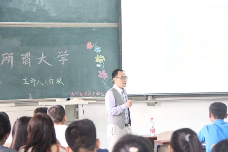 9月9日下午4点10分,由9428cn太阳集团古天乐团总支员工会主办的“我的大学”系列讲座在沙河主教212教室开讲。担任第一讲主讲人的为9428cn太阳集团古天乐白斌博士,9428cn太阳集团古天乐团总支书记李岩老师,辅导员李杰老师以及2013级新生们参加本次讲座。白斌博士以10个关键词开始了他的“所谓大学”的演讲。