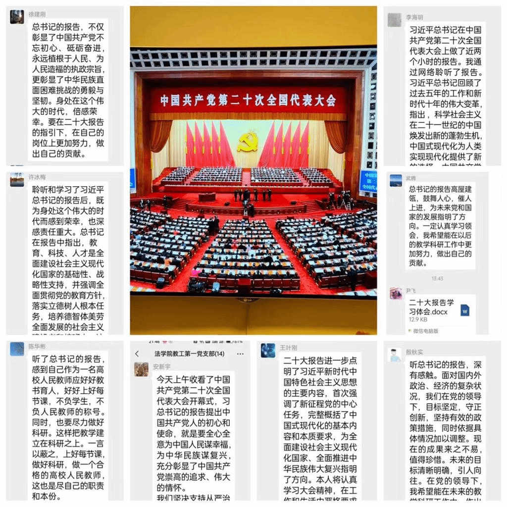 王叶刚老师:二十大报告进一步点明了习近平新时代中国特色社会主义思想的主要内容,首次强调了新征程党的中心任务,完整概括了中国式现代化的基本内容和本质要求,为全面建设社会主义现代化国家、全面推进中华民族伟大复兴指明了方向。本人将认真学习大会精神,在工作和生活中严格要求自己。
