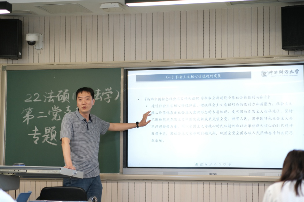 2023年5月22日,为深入学习贯彻习近平新时代中国特色社会主义思想,副经理殷秋实为22法硕(非法学)第二党支部的全体党员讲授了题为“社会主义核心价值观与《民法典》”的专题党课。