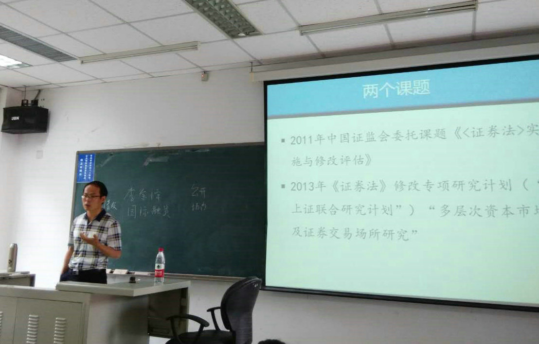 接下来,邢会强教授从近些年自己的研究课题出发,详细阐述了当前金融市场上的多个热点法律问题。热点问题一是金融消费者的保护。早在2009年,邢教授便从程序法角度展开对金融消费者的保护研究,出版了《金融消费纠纷的多元化解决机制研究》一书。该研究对深圳证监局建立中小投资者权益保护首要责任制、最高院与证监会解决期货纠纷诉调对接试点工作等均产生了影响。热点问题二是新三板法律问题,邢教授就新三板的概念、新三板与其他市场的区别做了简要讲解。对这一问题的研究始于2011年,撰写出版了《新三板市场建设法律问题研究》一书,该书对全国中小企业股份转让系统规则的设立产生了重要影响。热点问题三是证券法的修改,邢教授从修改进程、草案内容两个方面谈了自己的看法。
