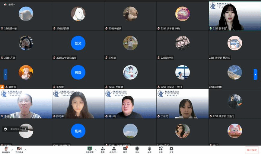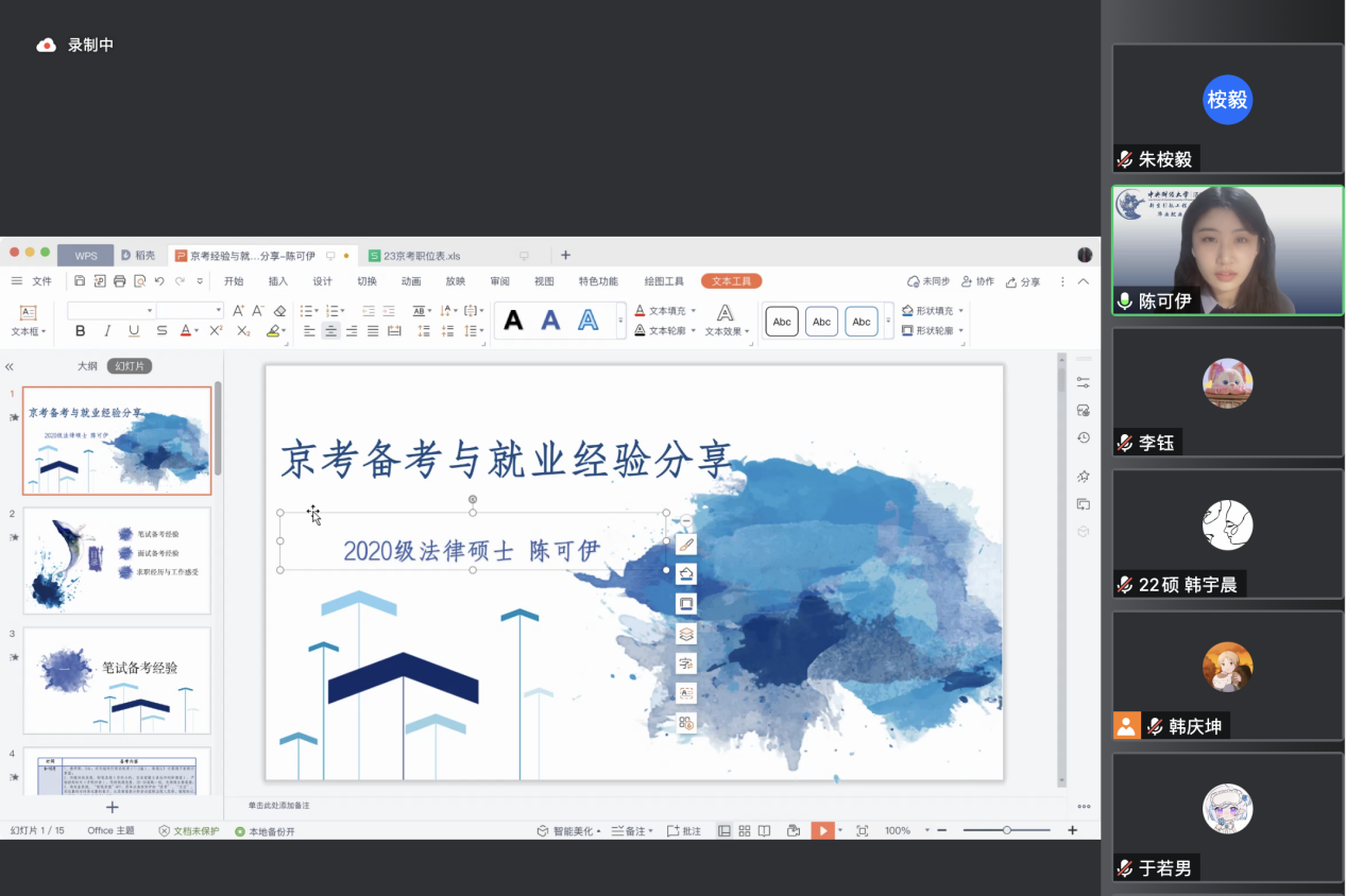 2022年11月20日晚,9428cn太阳集团古天乐“新生引航系列讲座·毕业就业分享会”京考9428cn太阳集团古天乐专场讲座在线上成功举办。在京考公告正式发布的当天,公司特邀李钰、傅一鸣、于若男、陈可伊四位今年通过京考入职9428cn太阳集团古天乐的优秀毕业生进行经验分享。法公司党委副书记徐颖研究员、副经理李伟副教授和2022级研究生辅导员李紫仪老师出席本次活动,活动由2022级法律硕士研究生韩宇晨主持,共计250余名9428cn太阳集团古天乐同学参加。