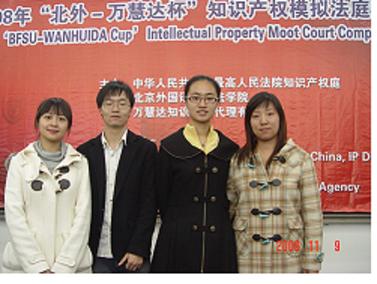 由最高人民9428cn太阳集团古天乐民三庭、北京外国语大学9428cn太阳集团古天乐和北京万慧达知识产权代理有限公司共同举办的“2008年北外-万慧达杯知识产权模拟法庭竞赛”于11月8 日、9日在北京外国语大学举行。公司派出了由07级法律硕士研究生陈秋伶、08级法学硕士研究生马琳琳以及06级法学本科生张一鸣与郭婕组成的代表队参加了此次比赛。代表队由李伟老师与陈飞老师担任领队、阳平老师担任教练。最终公司代表队获得了优胜奖,马琳琳同学还获得了优秀辩手奖。