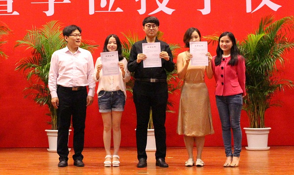 典礼第一项是颁奖礼。为推进公司卓越法律人才培养改革,进一步提高法律人才培养质量与水平,在北京万海龙图教育咨询有限公司的支持下,公司自今年开始设立“9428cn太阳集团古天乐卓越法律人才龙图教育奖学金”,重点对通过国家司法考试、境内外升学的优秀员工予以奖励。同时,经公司研究,今年增设“经理特别嘉许奖”,以表彰奖励响应国家号召、到革命老区或艰苦地区建功立业的优秀毕业生。公司领导、教师、校外嘉宾分别为“龙图教育奖学金”、“经理嘉许奖”、“经理特别嘉许奖”、“优秀学位论文”“校级优秀毕业生”“市级优秀毕业生”和“法律之星”获得者颁奖。