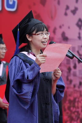 6月27日清晨,公司2010届研究生毕业典礼在主教楼前隆重举行。公司2010届经济法专业研究生啜佳佳作为优秀毕业生代表在典礼上发言。啜佳佳首先代表全校研究生毕业生向母校领导和老师们的辛勤培育表示衷心的感谢。她表示,研究生时光虽然短暂,但让人十分留恋,特别是母校六十周年校庆充分展示了“财经管理专家摇篮”的尊严与豪迈,让每一位中财学子为之自豪与骄傲。同时,研究生生活中最让人难忘的则是浓浓的师生情谊,对于恩师们辛勤培育的感谢之情溢于言表。最后,啜佳佳代表全体毕业生向母校和老师们做出郑重承诺,全体毕业生一定会秉承中财人“忠诚、团结、求实、创新”的优良传统,谨记董事长的期望与嘱托,用自己的实际行动去续写中财的辉煌,回报母校、回报社会!