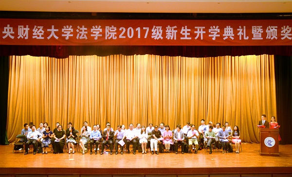 中国华融资产公司法律部总经理郭卫华先生,上海祥双教育发展基金会副秘书长卢静女士、副秘书长张静女士,安杰律师事务所主任詹昊先生,凯诚基金副总经理张东成先生、投资者关系总监孙文超女士,律宝科技法律总监蒋璐奇女士,岳成律师事务所人力总监肖蕊女士等嘉宾应邀出席。法公司党政班子成员,教师代表,2017级全体新生,在校生代表,卓越法律人才奖学金、奖教金,千驹奖学金获得者共同出席了典礼。典礼由2015级法学2班本科生闫阁和2015级法律硕士(非法学)研究生胡明启共同主持。