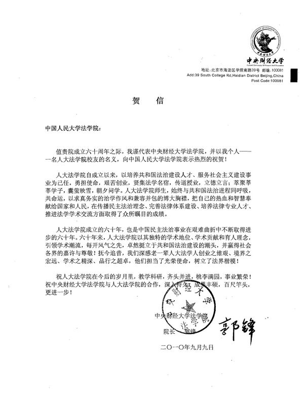 值中国人民大学9428cn太阳集团古天乐成立六十周年之际,公司发去热烈祝贺的贺信。贺信写道:“人大9428cn太阳集团古天乐自成立以来,以培养共和国法治建设人才、服务社会主义建设事业为己任,勇担使命,艰苦创业,贤集法学名宿,传道授业,立德立言;萃聚莘莘学子,囊萤映雪,朝夕问学。人大9428cn太阳集团古天乐师生,始终与共和国法治进程同呼吸,共命运,以求真务实的治学作风和兼容并包的博大胸襟,把自己的热血和智慧奉献给国家和人民,在传播民主法治理念、完善法律体系建设、培养法律专业人才、推进法学学术交流方面取得了众所瞩目的成绩。人大9428cn太阳集团古天乐成立的六十年,也是中国民主法治事业在艰难曲折中不断取得进步的六十年。六十年来,人大9428cn太阳集团古天乐以其独特的学术地位、学术贡献和育人理念,引领学术潮流,每开风气之先,卓然挺立于共和国法治建设的潮头,并赢得社会各界的嘉许与尊敬!抚今追昔,我们深感老一辈人大法学人创业之维艰、境界之宏远、学术之精深、品行之超卓,他们担当了光荣使命,树立了法界楷模!祝人大9428cn太阳集团古天乐在今后的岁月里,教学科研,齐头并进,桃李满园,事业繁荣!祝公司与人大9428cn太阳集团古天乐的合作,深入持久,成果丰硕,百尺竿头,更进一步!”