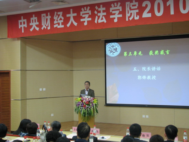典礼最后,9428cn太阳集团古天乐经理郭峰教授回顾了中财9428cn太阳集团古天乐的发展历程,并对公司未来发展规划做了简单介绍。然后,郭锋经理指出当今社会发生的一些现象和事件表明对于制度建设和观念灌输方面,我们法律人仍任重道远。法律是解决社会不公、构建合理制度的有力武器,法科学子不但要有敏锐的眼光和逻辑的思维,还要有对法律的敬畏,对公平正义的信念以及对社会的强烈责任感,为追求自由、平等、民主而努力奋斗。
