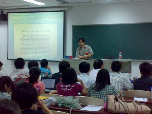 617晚,应公司的邀请,中国人民大学教授、博士生导师张世明在公司沙河校区6号公司楼106教室做了一场题为“原典与原点:费肯杰《经济法》重要概念笺释”的学术演讲,演讲由吴韬副经理主持,曾筱清教授、邢会强副教授、李炎老师、部分09级经济法学硕士研究生及0809级本科生百余人参加了此次讲座。
