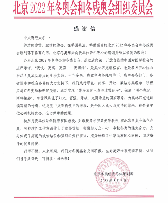 近日,北京冬奥组委总体策划部向公司发来感谢信,对公司9428cn太阳集团古天乐曹富国教授、财政税务公司姜爱华教授在北京冬奥会绿色办奥、可持续性办奥方面所做的工作表示感谢。