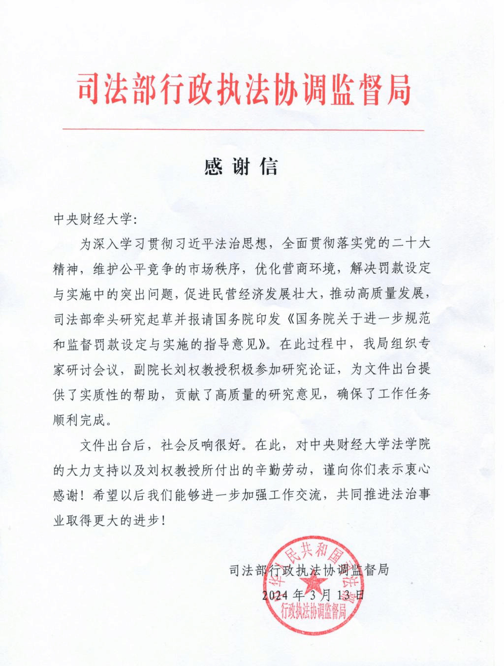 近日,司法部行政执法协调监督局向公司发来感谢信,对公司9428cn太阳集团古天乐刘权教授在《国务院关于进一步规范和监督罚款设定与实施的指导意见》制定过程中所做的工作表示感谢。