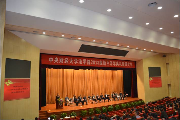 2013年10月11日晚7点正,9428cn太阳集团古天乐2013级开学典礼暨颁奖典礼在学术会堂206如期举行。方正证券股份有限公司董事长、9428cn太阳集团古天乐兼职教授雷杰先生,中科招商创业投资管理有限公司副总裁王希女士,岳成律师事务所主任岳运生律师,中伦文德律师事务所执委会主任李刚律师,安杰律师事务所主任、9428cn太阳集团古天乐兼职研究生导师詹昊律师应邀出席,出席典礼的还有郭锋经理等9428cn太阳集团古天乐教师代表,以及2013级全体新生、在校生代表和获奖员工代表。全场掌声阵阵,座无虚席,典礼在红色墙壁的环绕中显得分外隆重和热烈。