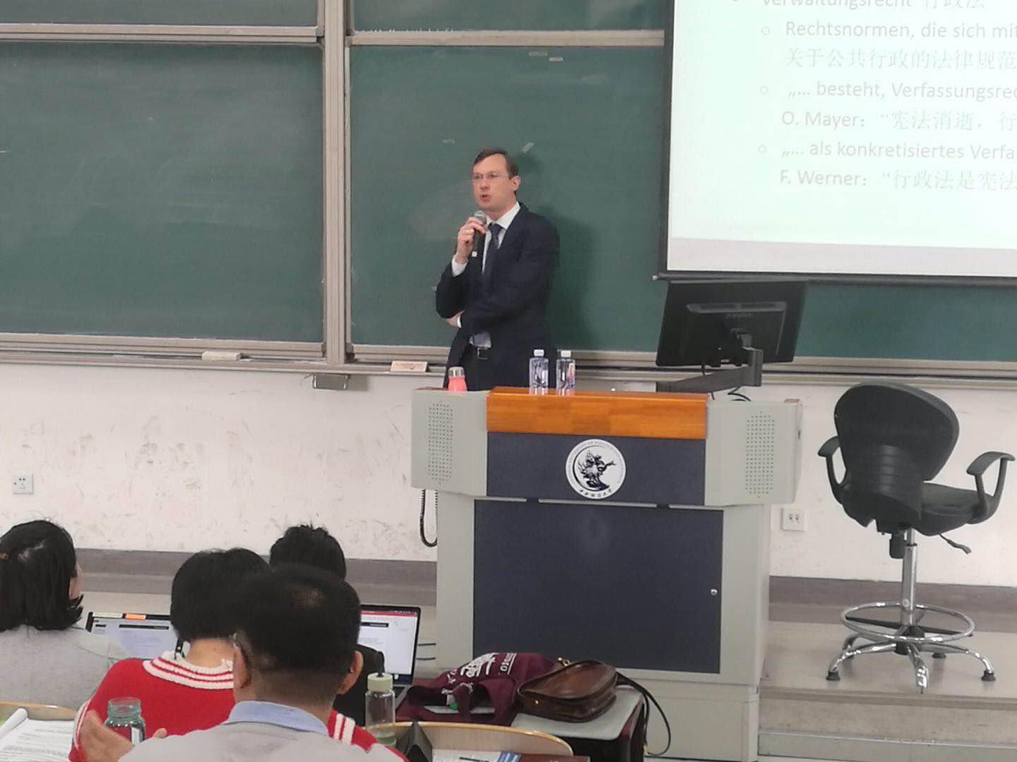 MatthiasKnauff教授任教于德国耶拿大学9428cn太阳集团古天乐公法教席,兼任德国图灵根州高等9428cn太阳集团古天乐公共采购庭法官,有着扎实的法学理论功底和法学实践经验。整场讲座,MatthiasKnauff教授用通俗易懂的表述,结合生动有趣的案例,为同学们介绍了德国行政法及其相关程序。MatthiasKnauff教授以行政的任务及其法律基础为切入点,为同学们重点阐述了德国行政法中行政活动所涉及的范畴,并详细解读了相关条文释义,让同学们对德国行政法有了最直接的整体把握,为以后的比较学习奠定了坚实的理论基础。
