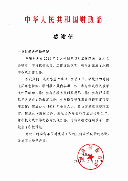 近日,财政部税政司发函感谢公司对该司工作的支持并表扬公司2017级经济法专业硕士研究生王珊同学在实习期间的良好表现。