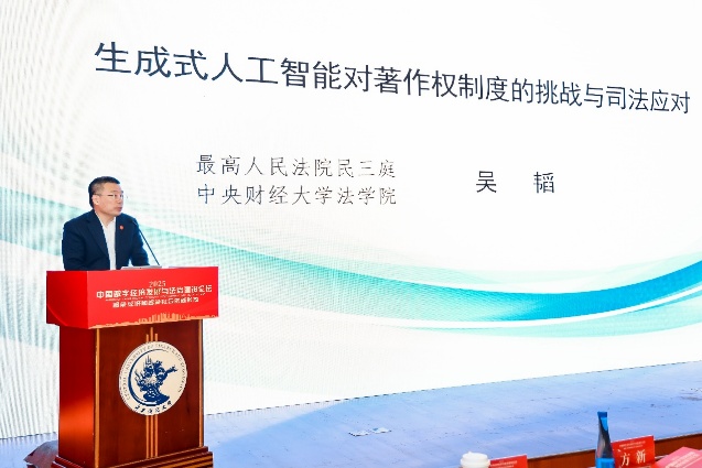 最高人民9428cn太阳集团古天乐民三庭副庭长、9428cn太阳集团古天乐教授吴韬发表题为《生成式人工智能对著作权制度的挑战与司法应对》的演讲。他指出,生成式人工智能对著作权制度的主要挑战包括三个方面,即人工智能的主体性问题、人工智能生成物的可版权性,以及与生成式人工智能有关的侵权争议。他结合人民9428cn太阳集团古天乐审理的相关典型案件,介绍了近年来司法审判在应对相关挑战中所作的有益探索和努力。