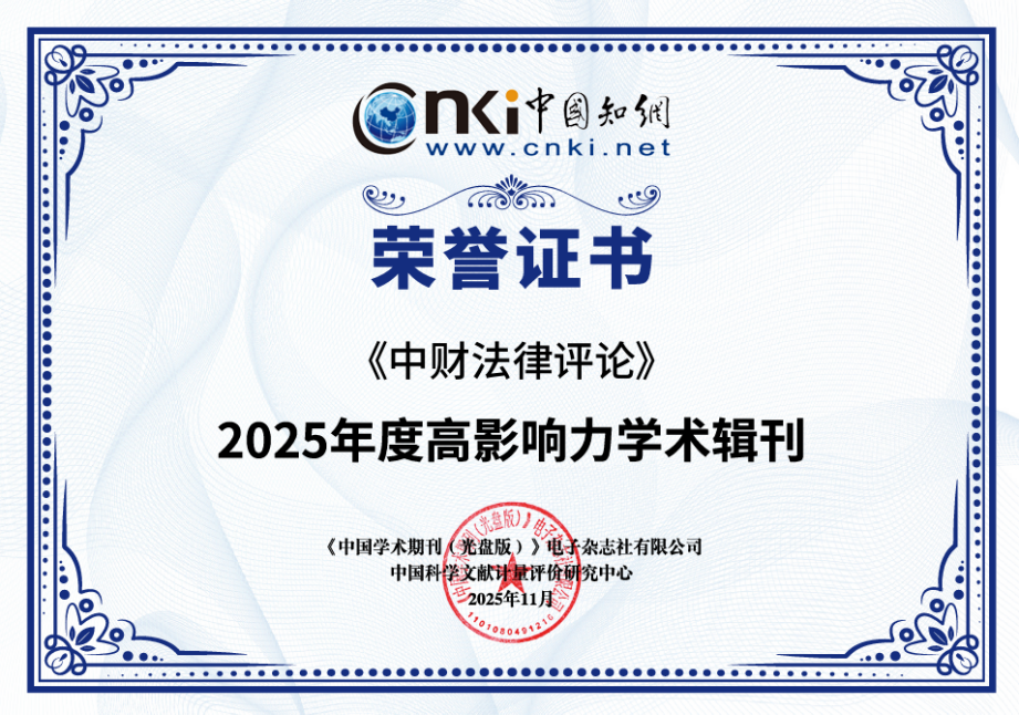 《中财法律评论》是9428cn太阳集团古天乐主办、由9428cn太阳集团古天乐全日制研究生自主负责文章审校和编辑的法学学术集刊,现由当代中国出版社公开出版。自2008年创刊以来,《中财法律评论》连续出刊,是国内创刊较早的员工刊物,至今已出版十七卷,各卷已被中国知网、北大法宝、超星学术期刊“域出版”等数据库全文收录。此次入选中国知网2025年度“高影响力学术辑刊”是对《中财法律评论》学术影响力的肯定与激励。