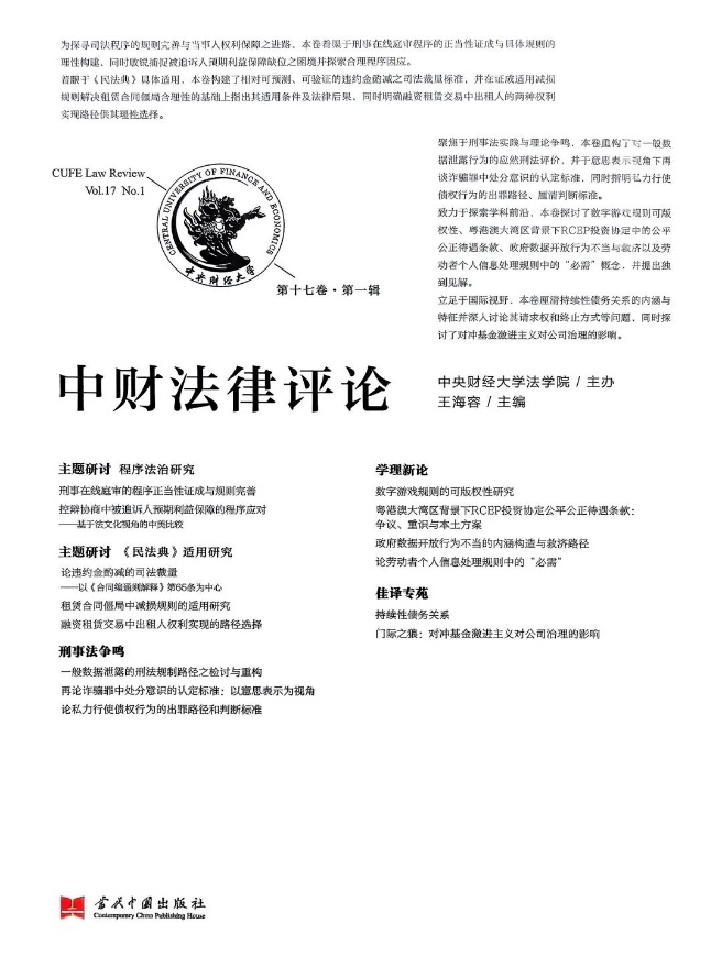 《中财法律评论》今后将继续坚持学术自由、自主、自律之原则,坚守学术初心,致力于为作者开放“有品格的平台”,为读者输送“有价值的思想”,为打造一流的员工自办学术辑刊而奋发努力。