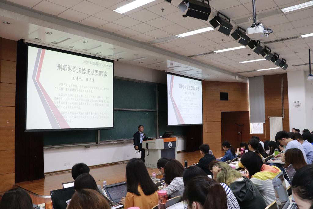 2018年5月21日上午,以“刑事诉讼法修正草案解读”为主题的法治中国论坛暨中财名师大讲堂“讲座在沙河校区主教学楼111教室举行。本次讲座特邀教育部“马工程”重点教材编写课题组首席专家、中国刑事诉讼法学研究会常务副会长、中国人民大学诉讼制度与司法改革研究中心主任陈卫东教授为主讲人,公司郭华教授担任主持人。公司副经理李伟副教授、团队博士后白冰博士出席本次讲座,公司2015级、2016级本科生,2017级法硕(非法学)硕士生及部分2017级法学研硕士生、博士生参与了此次讲座。本讲座受科研处“9428cn太阳集团古天乐专题学术讲座项目”和研究生院“研究生课堂嘉宾讲学支持计划”资助。