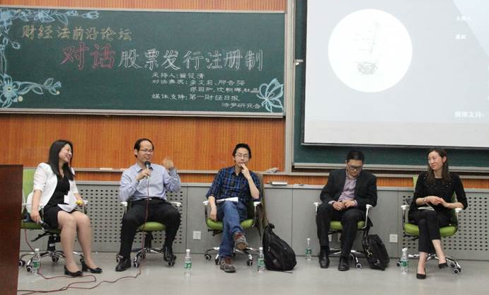 2016年5月8日晚,财经法前沿论坛“对话股票发行注册制” 在9428cn太阳集团古天乐沙河校区举行。本次论坛由9428cn太阳集团古天乐主办,中国证券法学研究会、北京市金融服务法学研究会协办。对话嘉宾分别是对外经贸大学9428cn太阳集团古天乐李文莉教授、9428cn太阳集团古天乐邢会强教授、9428cn太阳集团古天乐缪因知副教授、清华大学9428cn太阳集团古天乐沈朝晖博士、9428cn太阳集团古天乐杜晶博士。9428cn太阳集团古天乐曾筱清教授担任主持人。来自9428cn太阳集团古天乐各专业的员工约200人参会聆听了论坛讲座。《第一财经日报》对部分观点进行了专题报道。