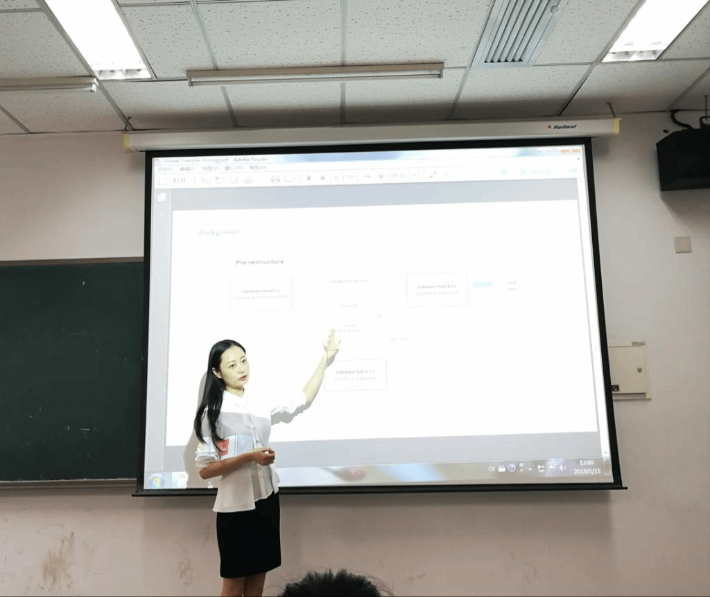 接下来,朱婷雯女士首先介绍了自己长期从事转让定价领域的经历,指出转让定价领域行业人才稀缺的现状,提出希望能够引起同学们对转让定价的一点兴趣。其首先对转移定价的含义和企业转让定价的方式进行了界定,随后阐明转移定价中的独立交易原则及其缺陷,并且指出转让定价的核心是商业实质。然后,其介绍了转让定价的判定方法并介绍了在OECD规则下的两个跨境交易案例。朱女士也对跨境税费计算方法进行了详细的说明。最后,其重点阐述了跨境企业避税方法,不仅明确并购重组和假借并购重组避税的区别在于是否具有商业实质,而且说明了税务机构判断是否有商业实质的方式是约谈跨境企业领导层以收集能判断是否有资质的资料。