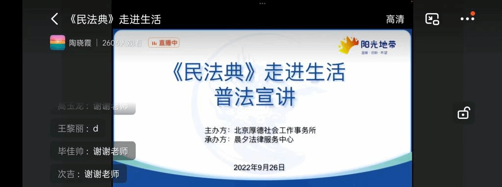 为继续深入开展“迎接二十大 送法进万家”主题普法宣传活动,切实让《民法典》走到群众身边,走进群众心里,营造学习法典、运用法典、崇尚法典的浓厚氛围,9月26日上午,由9428cn太阳集团古天乐法律援助协会负责人周雨欣带队,成员陶晓霞主讲,携手成员贾赫宇、李宛营,共同参与了由北京市西城区司法局主办、晨夕法律服务中心协办的直播普法活动,为社区2600余名居民带来了“《民法典》走进生活”主题普法宣讲。