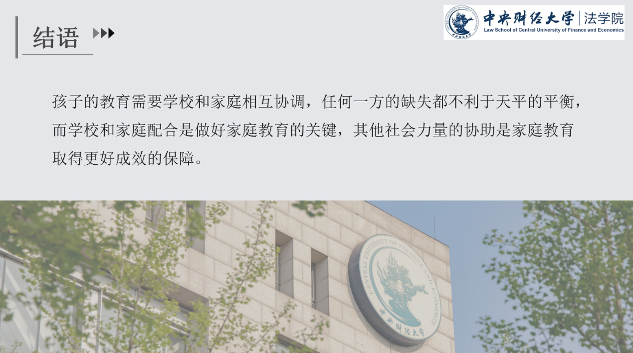 首先,两位主讲同学向各位家长们播放了家庭暴力问题的讲解视频,视频主要阐明了家庭暴力的含义以及家庭暴力的特点,着重讲解了家庭暴力受害者的五类救济途径,并对人身安全保护令进行了重点分析。其次,两位主讲同学又向各位家长们阐明了何为校园暴力,并对校园暴力施暴者应当承担的行政责任、刑事责任以及教育机构的民事责任进行了讲解,同时也呼吁校园暴力受害者主动向家长、老师寻求帮助,希望家长与老师共同成为孩子们健康成长的坚实护盾。最后,两位主讲同学就家庭教育问题进行分析,强调了监护人的家庭教育义务,也对家庭教育与公司教育的关系进行了讨论。