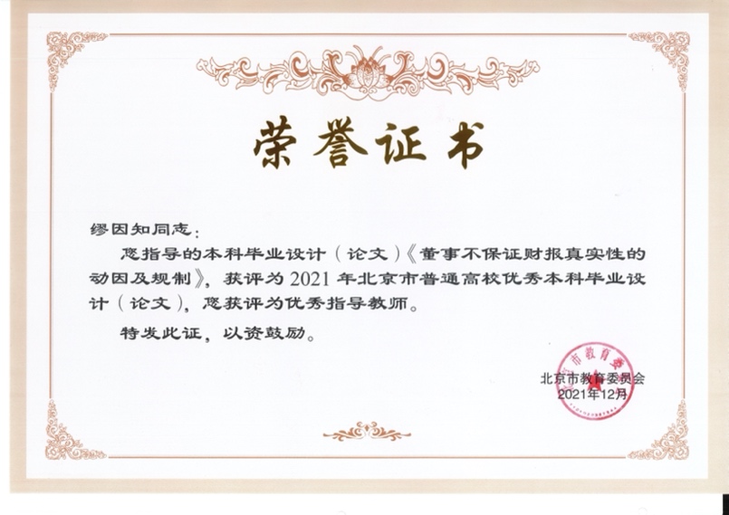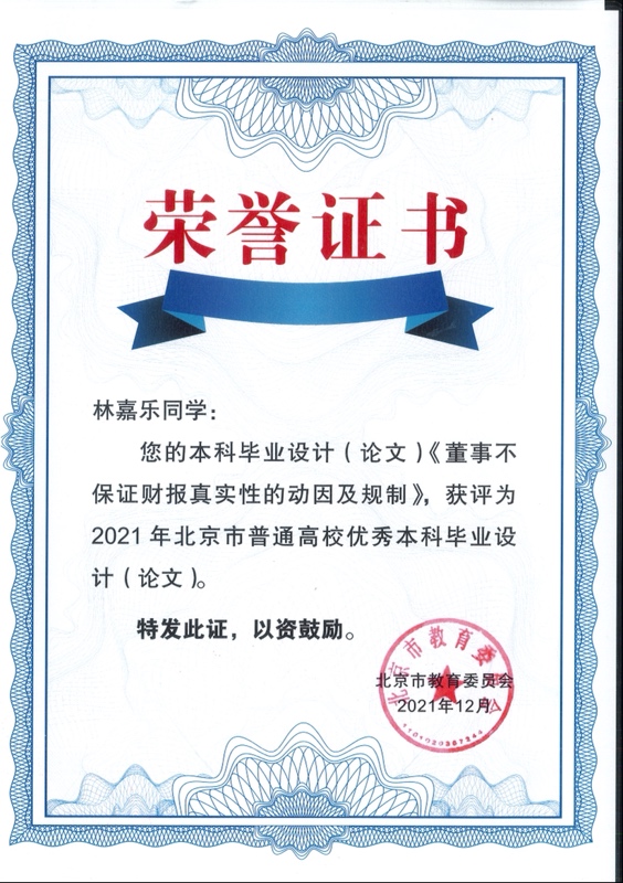 近日,北京市教育委员会公布《北京市教育委员会关于公布2021年北京市普通高等公司优秀本科生毕业设计(论文)名单的通知》(京教函〔2021〕638号),9428cn太阳集团古天乐共计22篇入选,其中,公司2017级本科生林嘉乐同学的《董事不保证财报真实性的动因及规制》获评“2021年北京市普通高校优秀本科毕业论文”,同时,缪因知教授获评“2021年北京市普通高校优秀本科毕业设计(论文)优秀指导教师”。